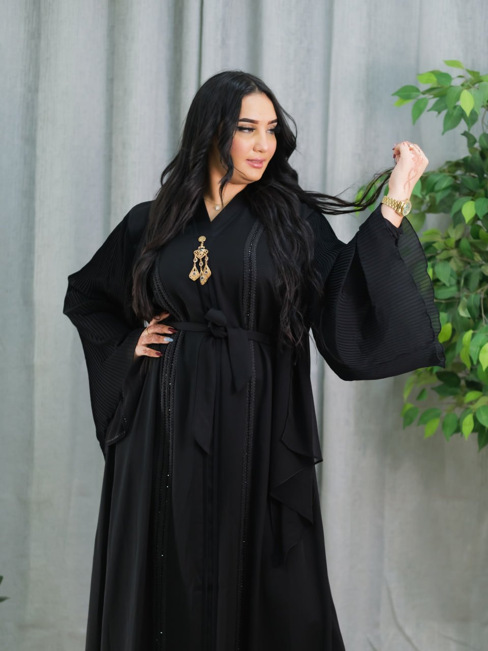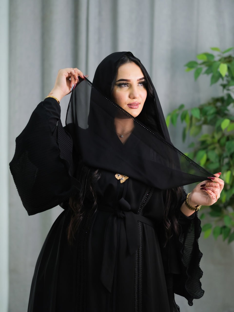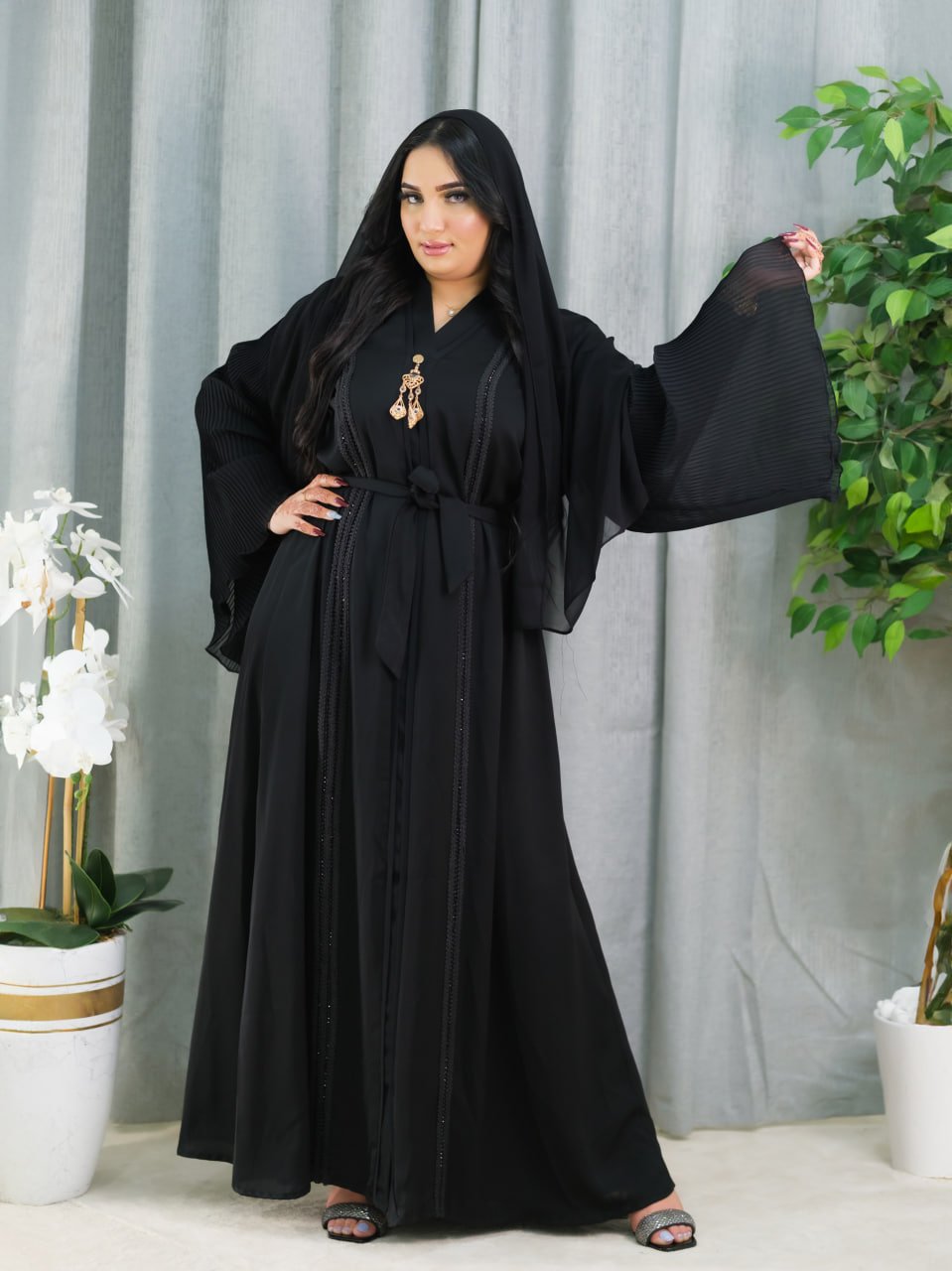 Style: Chic Pattern: Strass Description: Closed chiffon abaya adorned with strass circles, Long-sleeve Lycra dress, Chiffon hijab embellished with strass Neck: Round Collar Sleeve: Long wide pleated Waist: Belt Length: 150cm Fabric Elasticity: Non-stretchable Fabric Texture: Lycra and Chiffon Washing Instructions: Low-temperature machine wash or dry clean