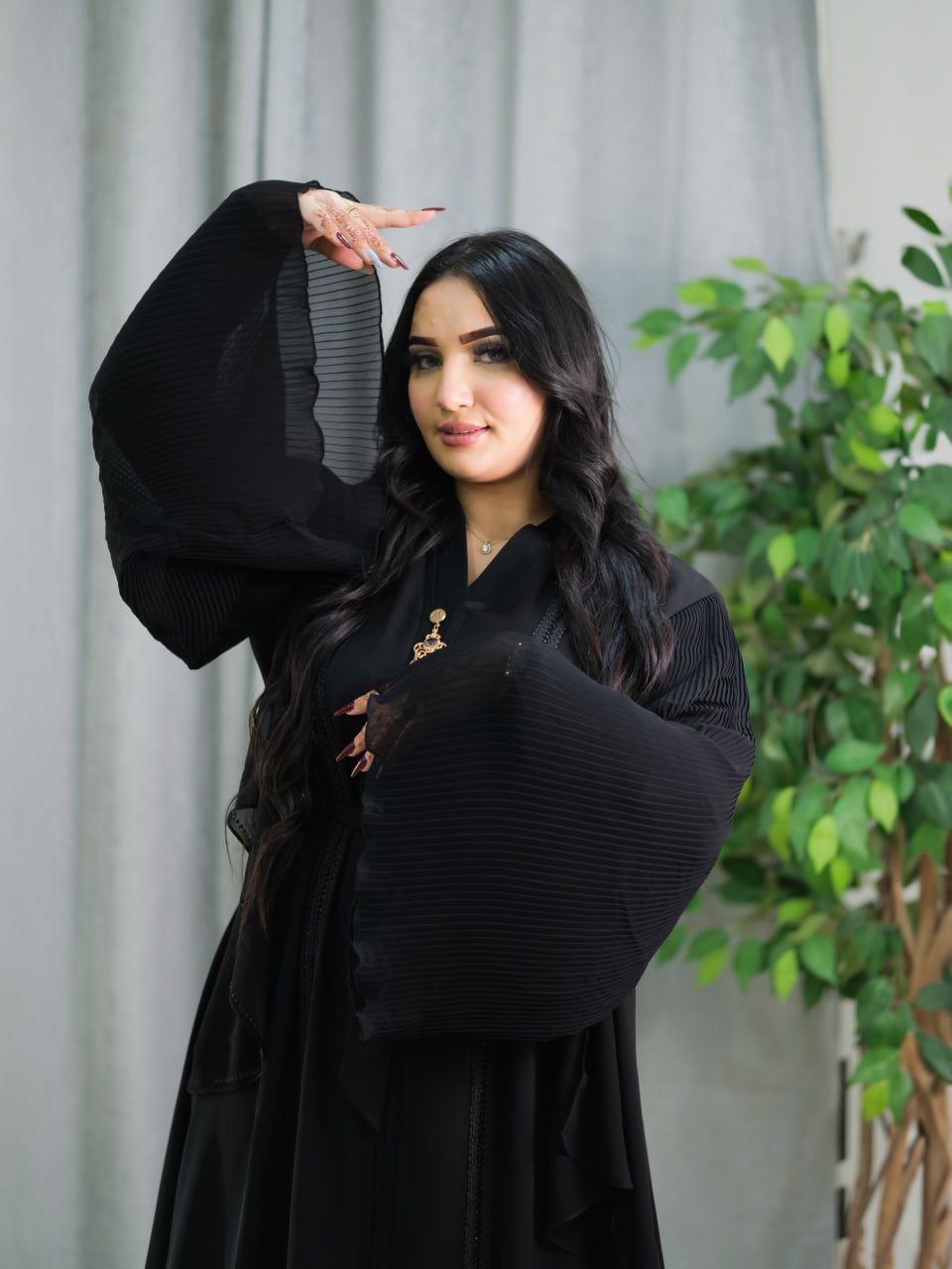 Style: Casual Pattern: Geometric Description: Closed Abaya with wide butterfly sleeves, elastic Cuff, Elastic Waist Neck: Regular Sleeve: Long and wide Length: 150 cm Fabric Elasticity: Non-stretch Fabric Texture: Crepe Washing Instructions: Low-temperature machine wash or dry clean