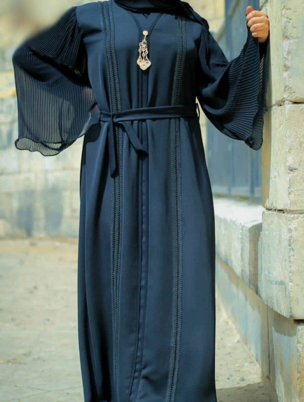 Style: Chic Pattern: Veined Description: 3-piece Abaya, Long-sleeve Lycra Inner Dress, Long Chiffon Outer Dress with Serma Embroidery and Adjustable Inner Belt, Chiffon Hijab Neck: Round Collar Sleeve: Long Wide Waist: Adjustable Inner Belt Length: 150cm Fabric Elasticity: Stretchable Fabric Texture: Lycra and Chiffon Washing Instructions: Low-temperature machine wash or dry clean