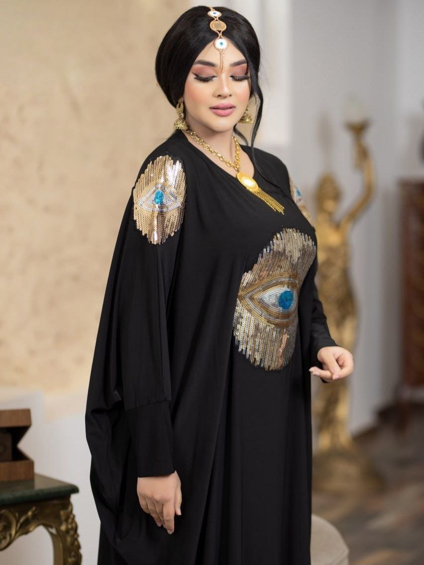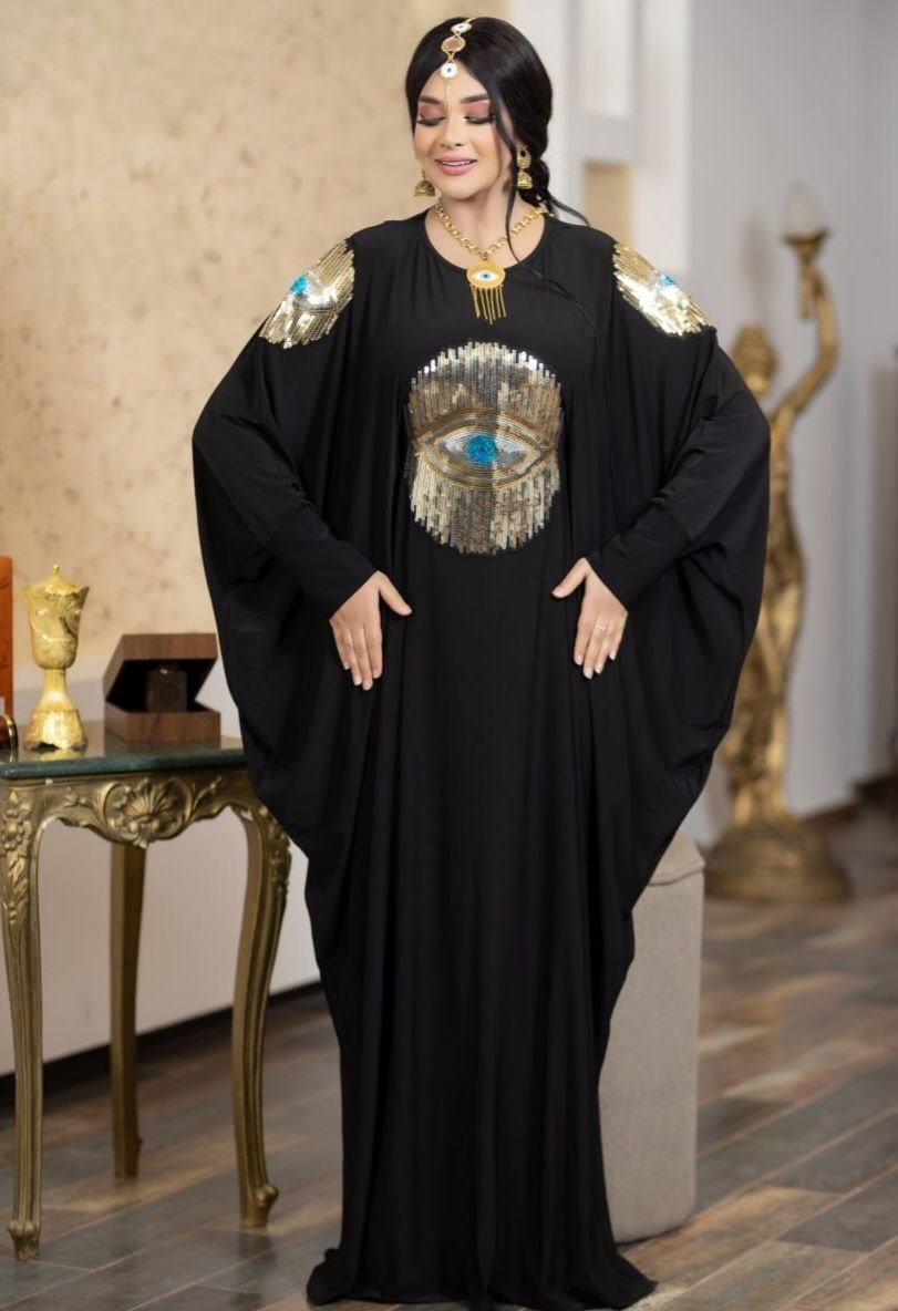 Style: Jalabya4 Pattern: Embroidery Description:Â jellabiya decorated with Embroidery, open shoulder Neck: Round Collar Sleeve: Long and Wide open shoulder Length: 160cm Fabric Elasticity: Not Stretchable Fabric Texture: Crepe