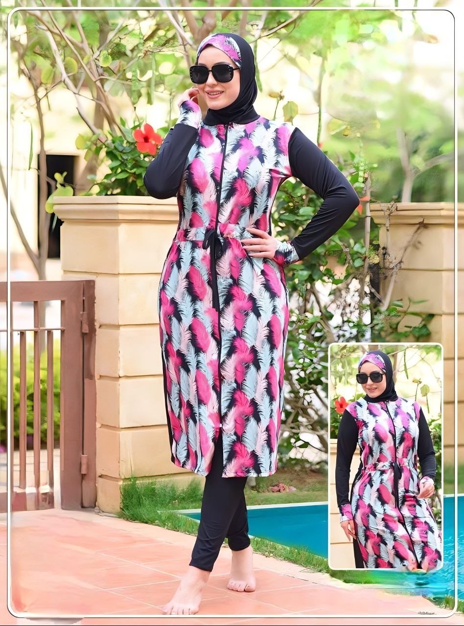 Style: Swimwear Pattern: Random Description: Burkini, 3 pieces, Jumpsuit with Front Zipper, sleeveless jacket , Random print, Hidden Belt, cap Neck: Slightly High Collar Sleeve: Long Waist: Hidden Belt Fabric Elasticity: Stretchable Fabric Texture: Jumpsuit: Lycra / jacket: Polyester
