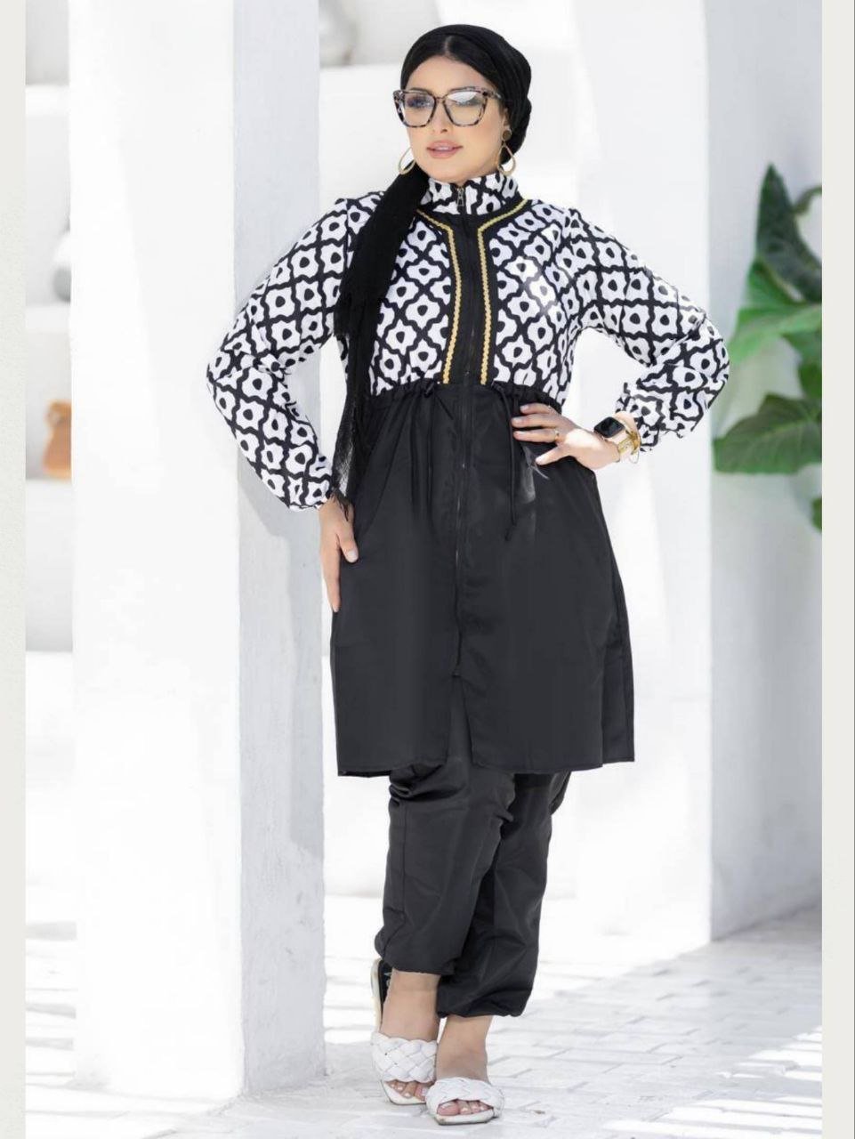Style: Swimwear Pattern: Geometric Description:4-piece Burkini set, long jacket with long zipper, hidden waist belt, elastic waist pants, Cap, bag Neck: Slightly high Collar Sleeve: Long with elastic cuffs Waist: Belt Fabric Elasticity: Non-stretch Fabric Texture: Polyester