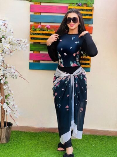 Style: Swimwear Pattern: Random Description: 4-piece Burkini set, Bodysuit with chest zipper, Pants, Skirt, Chiffon scarf Neck: Slightly high Collar Sleeve: Long Waist: Regular Fabric Elasticity: Stretchable Fabric Texture: Quick-dry Lycra Washing Instructions: Hand wash, do not use dry clean