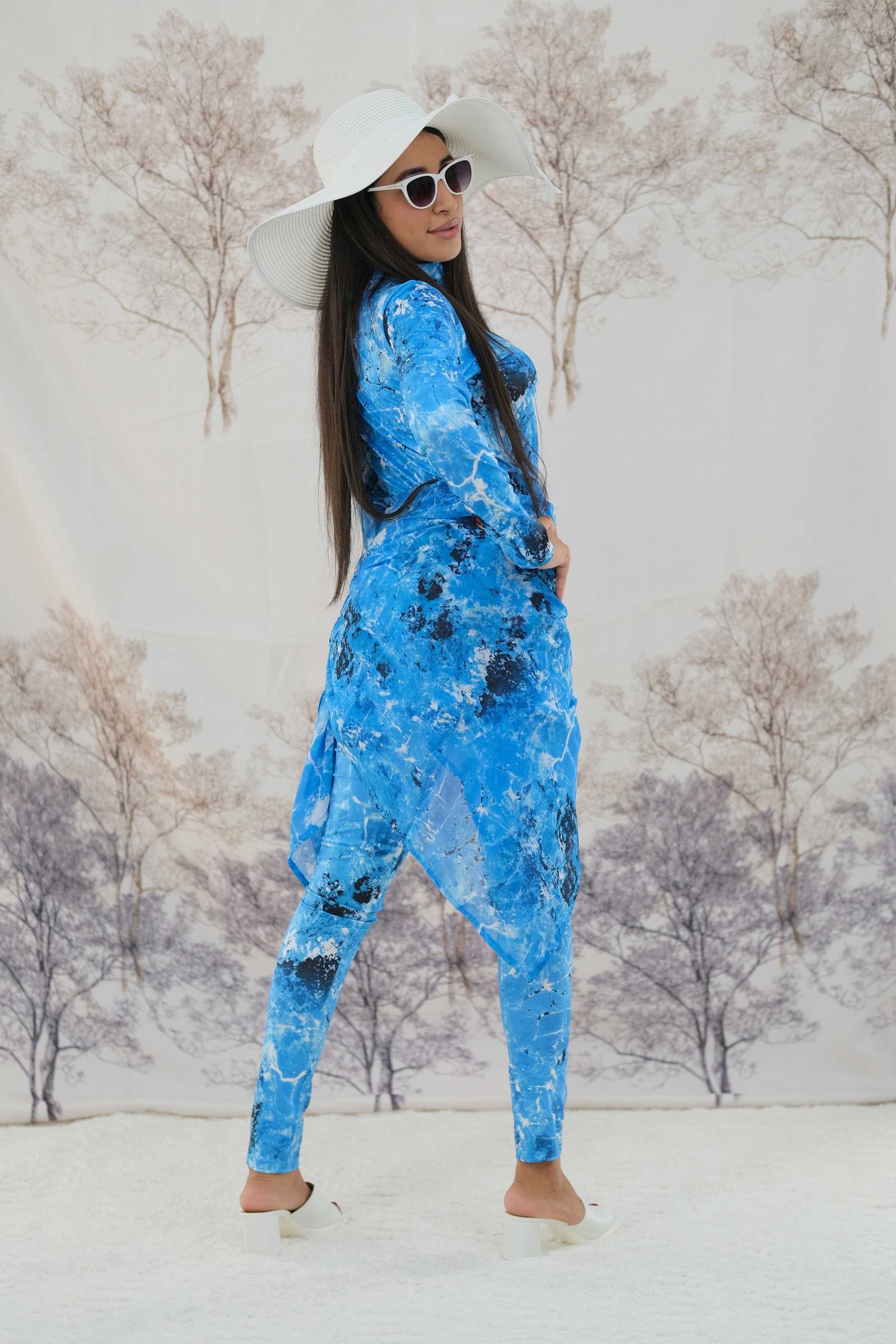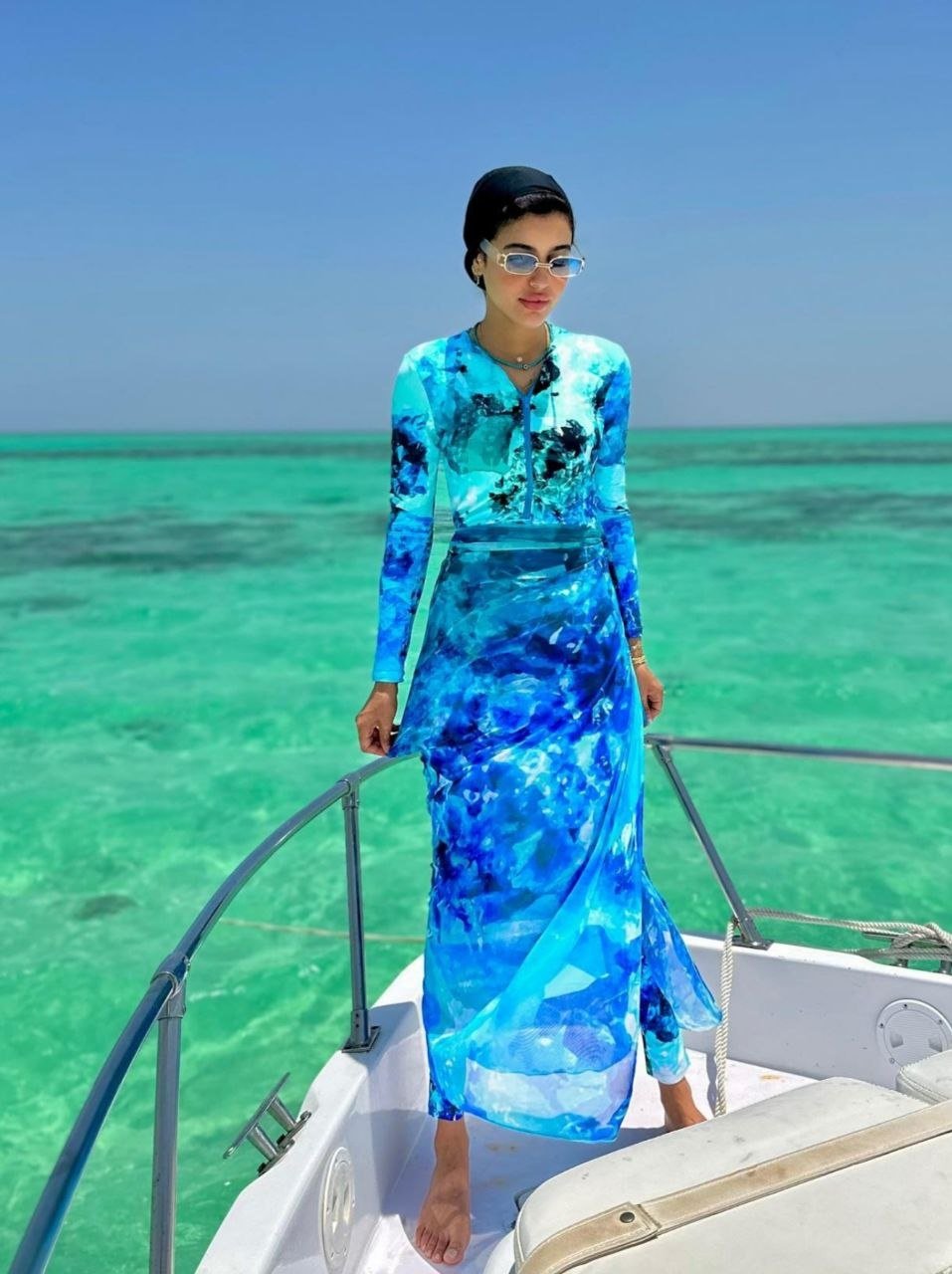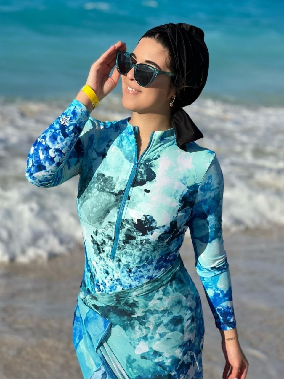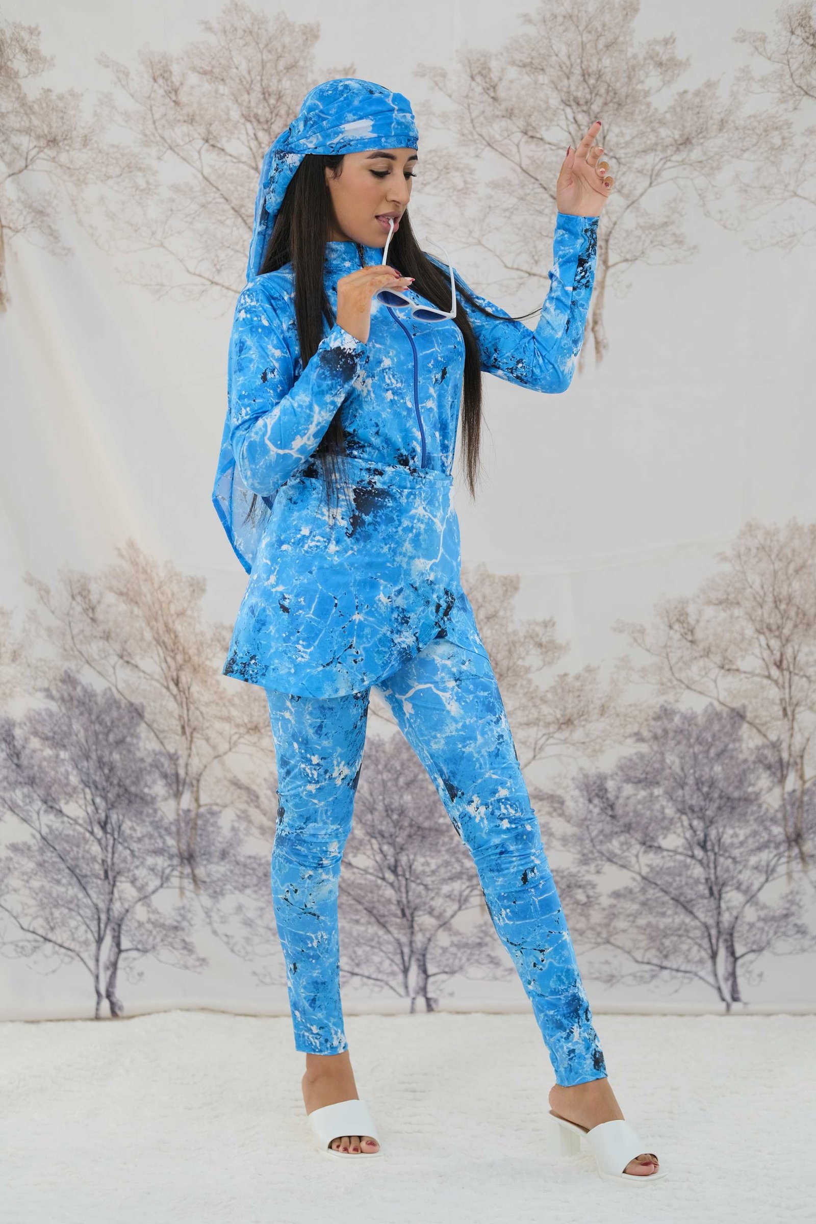 Style: Swimwear Pattern: Wavy Description: 3-piece Burkini set, long blouse with ruffle at the waist and zipper on chest, pants, Cap Neck: Round Collar Sleeve: Long Waist: Regular Fabric Elasticity: Stretchable Fabric Texture: Quick-dry Lycra
