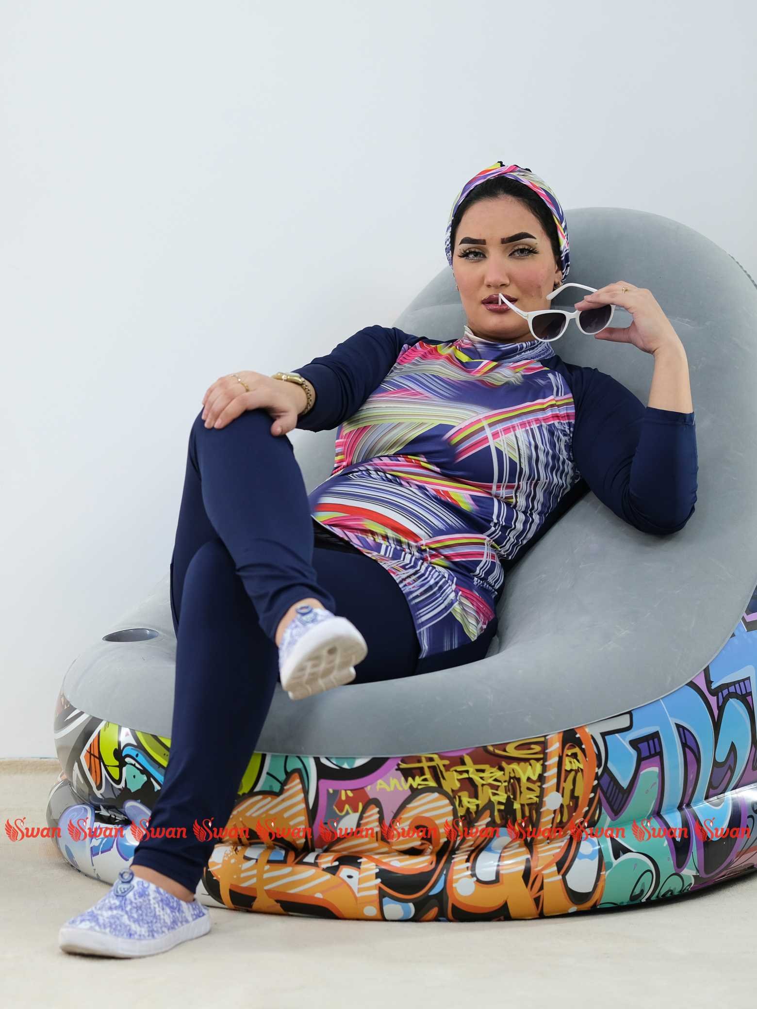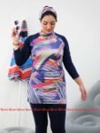 Style: Swimwear Pattern: Wavy Description: 4-piece Burkini set, Bodysuit with chest zipper, Pants, Skirt, Chiffon scarf Neck: Slightly high Collar Sleeve: Long Waist: Regular Fabric Elasticity: Stretchable Fabric Texture: Quick-dry Lycra Washing Instructions: Hand wash, do not use dry clean