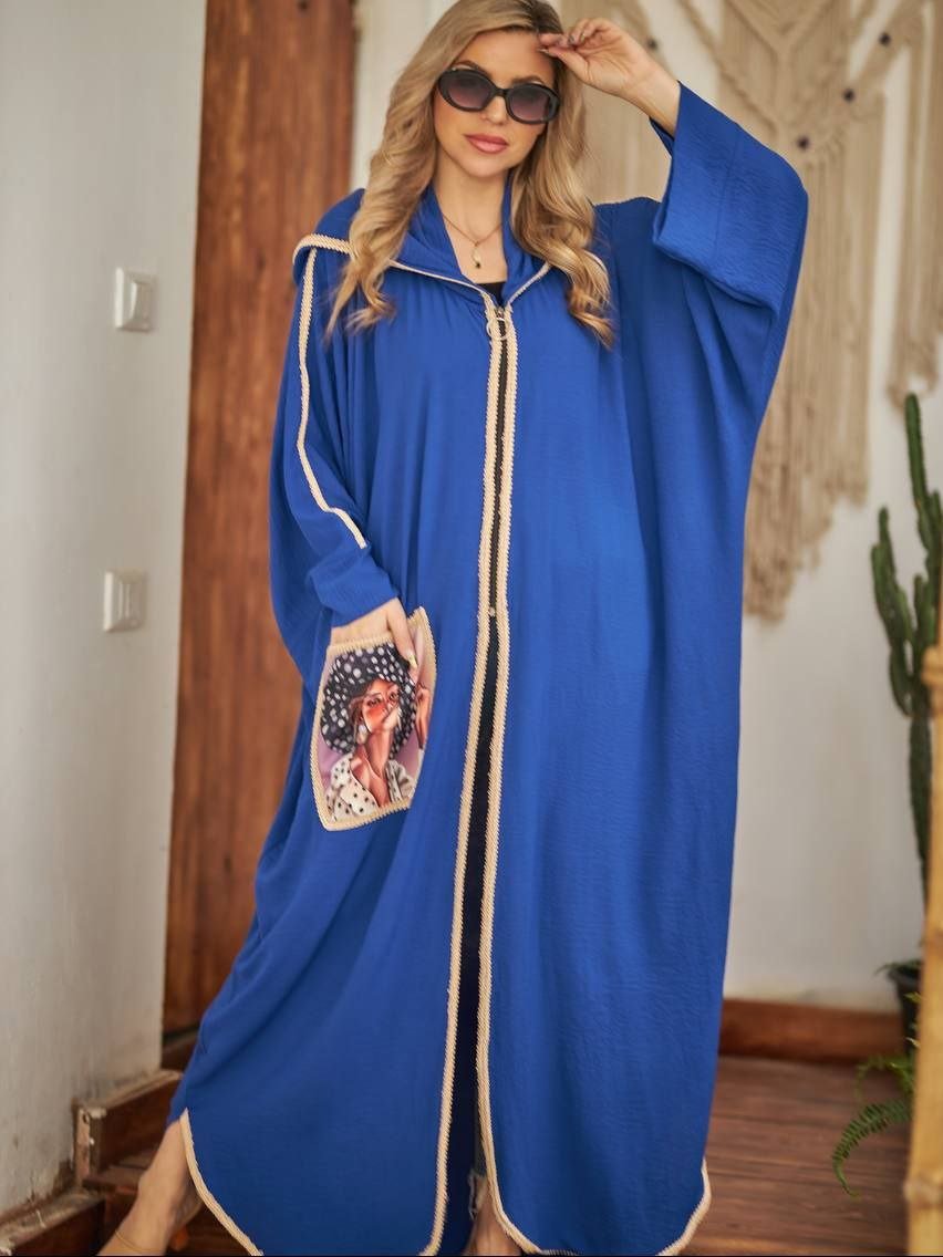 Style: Casual Chic Pattern: Traditional Description: Bisht with traditional Etamin embroidery and decorated with Lires on the chest and sleeve Sleeve: Long Slim with Small Zipper Length: 155 cm Fabric Elasticity: Slightly stretchable Fabric Texture: Crepe
