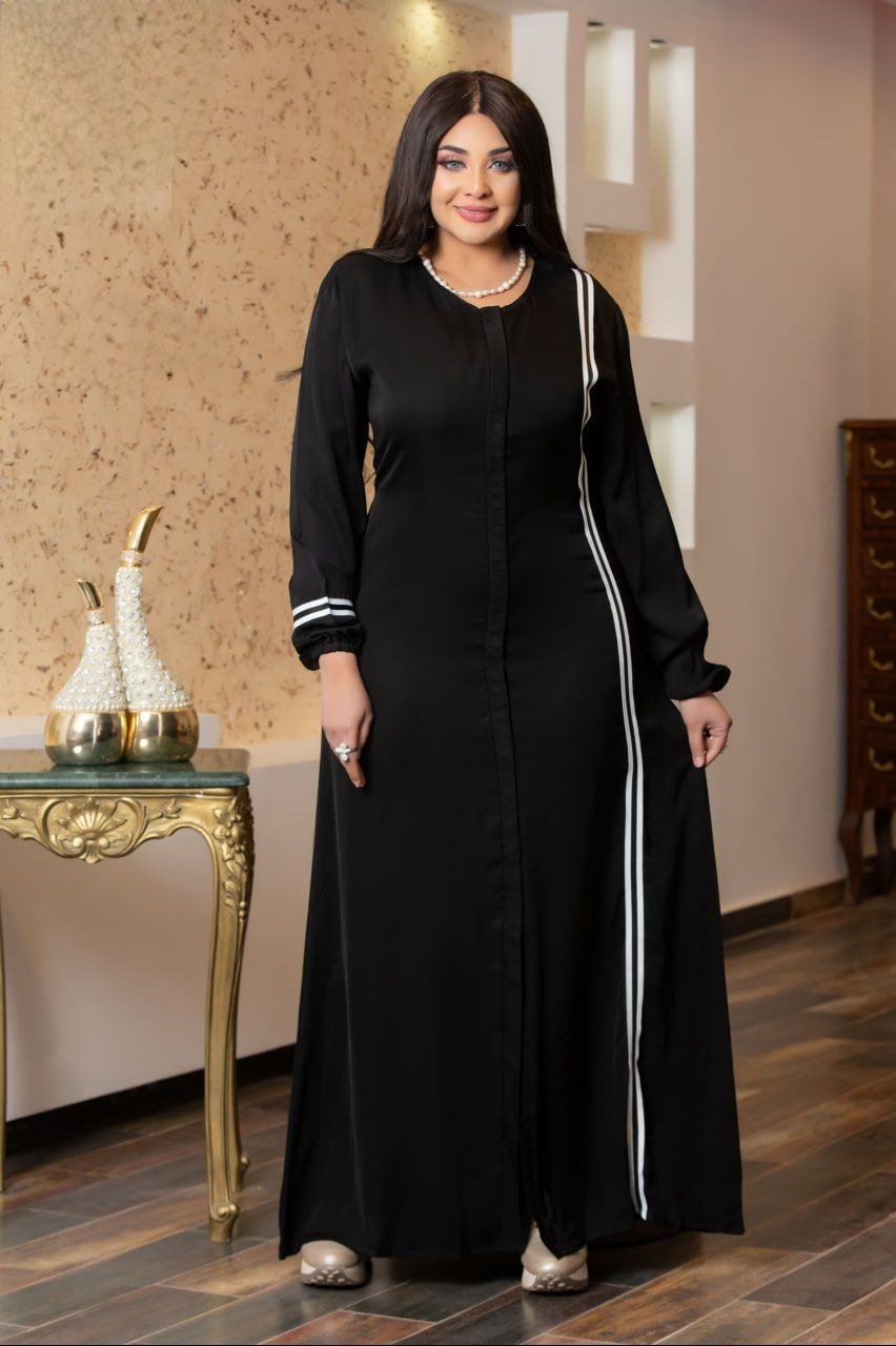 Style: Chic Pattern: Striped Description: close Abaya decorated with strips along of the abaya and snaps on the chest, with Hijab decorated Ribbons Neck: Round Collar Sleeve: Long with elastic cuffs Waist: Hidden Inner Belt Length: 150cm Fabric Elasticity: Non-Stretch Fabric Texture: Crepe CY