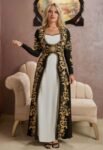 Style: Chic Pattern: Embroidery Description:3-Piece Kaftan, plain crepe Dress without sleeves, handmade -embroidered Bisht, Separate belt Neck: Slightly High Collar Sleeve: Long with elastic cuffs Waist: Separate belt Length: 150cm Fabric Elasticity: Stretchable Fabric Texture: Bisht Light velvet & Satin, Dress Crepe