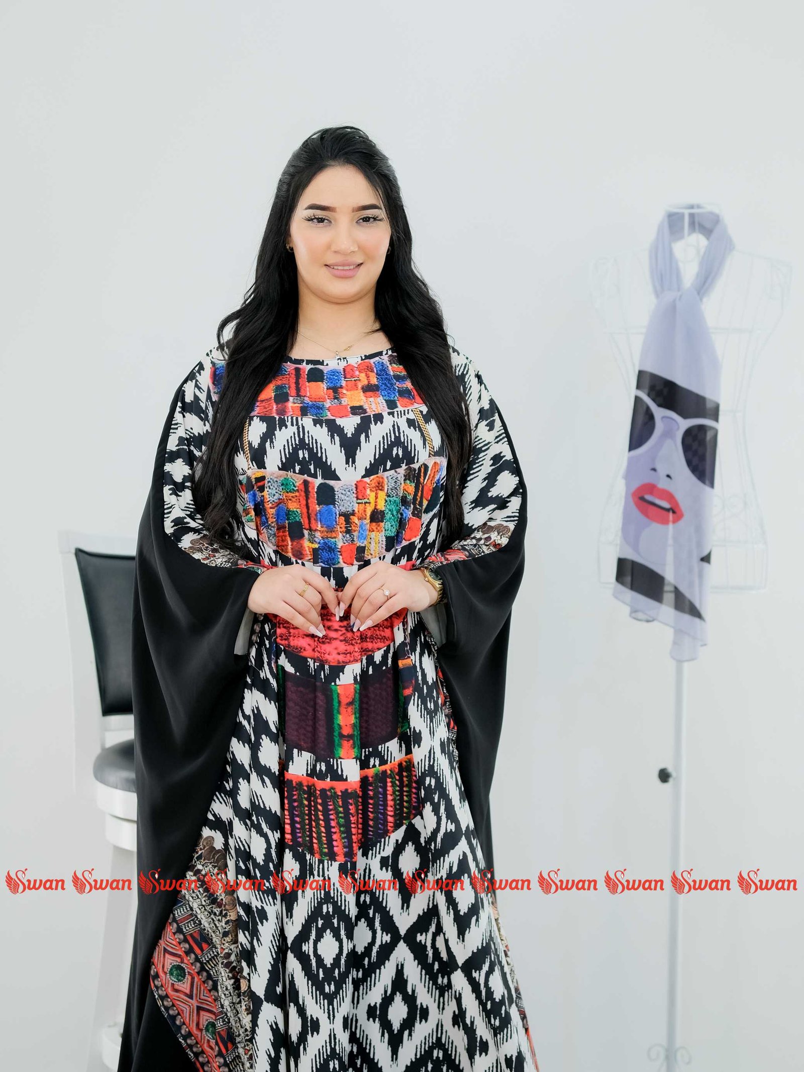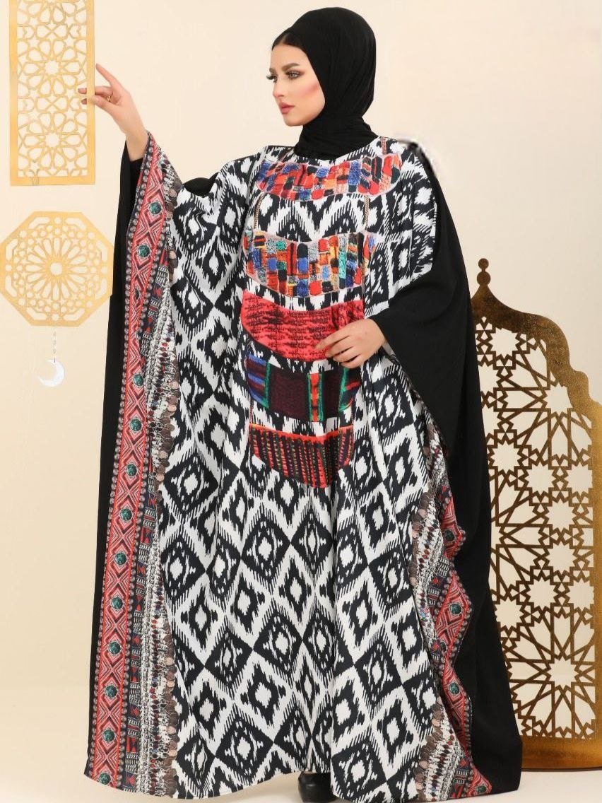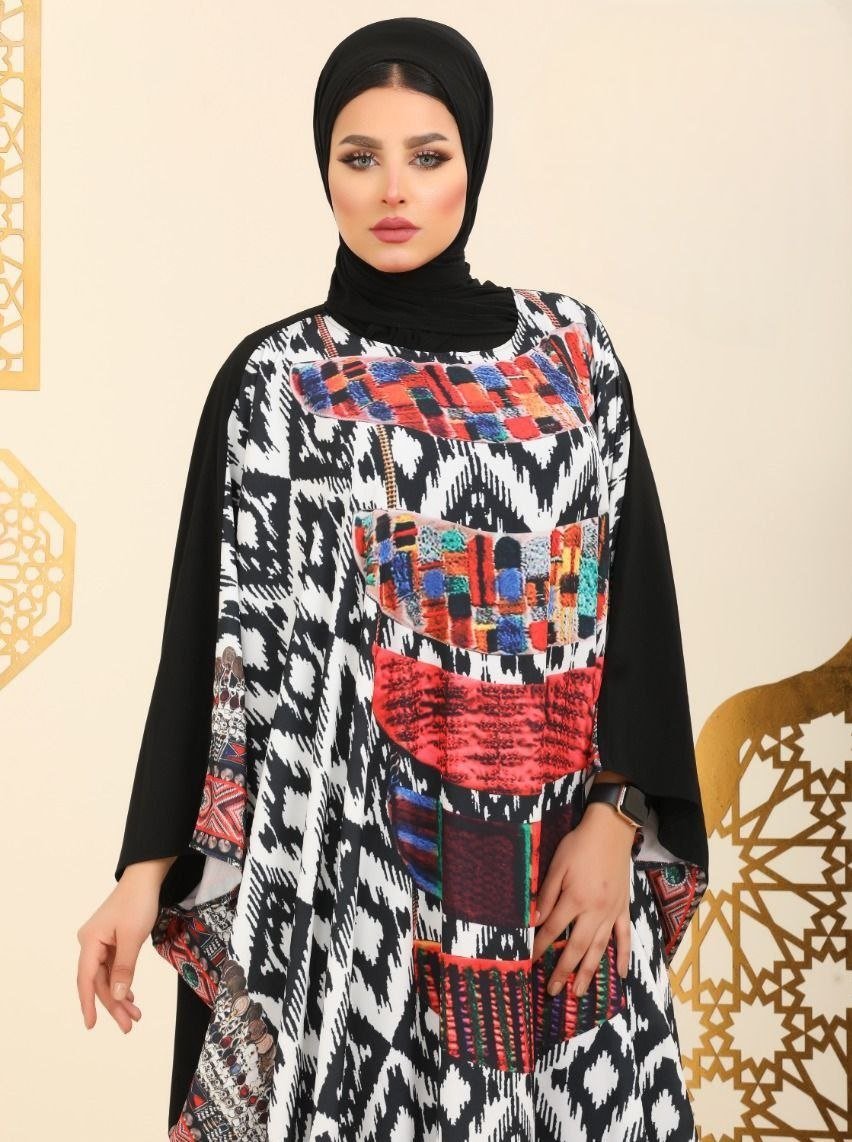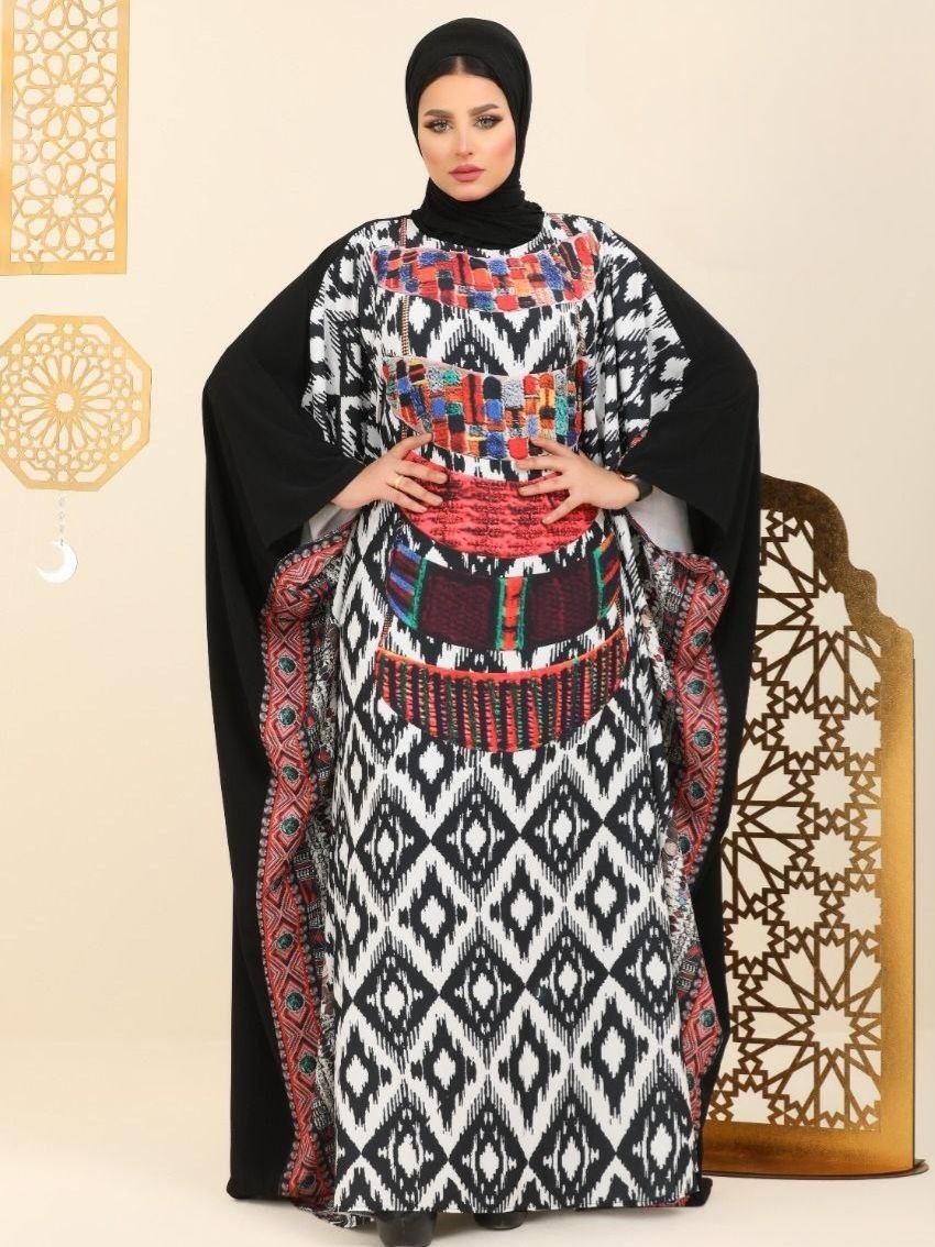 Style: Homewear Pattern: Geometric Description: Jalabiya with printed circles Neck: Formal V-Collar Sleeve: Wide long sleeves Waist: Cloche Length: 142 cm Fabric Elasticity: Non-stretch Fabric Texture: Cotton Washing Instructions: Low-temperature machine wash or dry clean