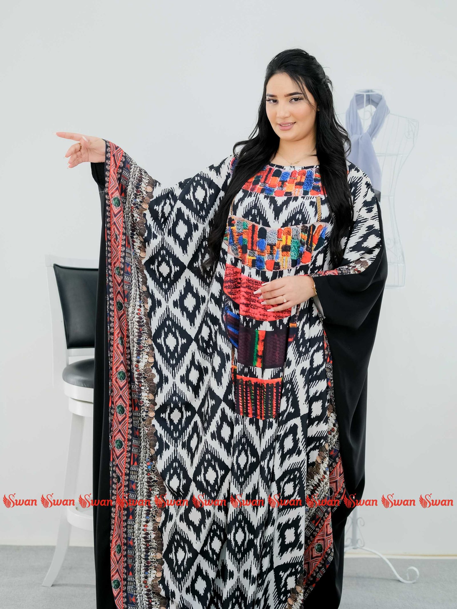 Style: Homewear Pattern: Striped Description: Jalabiya with printed lines and triangles, Sequins embroidery on the chest, hidden belt at the waist Neck: V-Collar Sleeve: Long and wide Waist: Hidden belt Length: 142cm Fabric Elasticity: Non-Stretch Fabric Texture: Cotton Viscose Washing Instructions: Low-temperature machine wash or dry cleaning