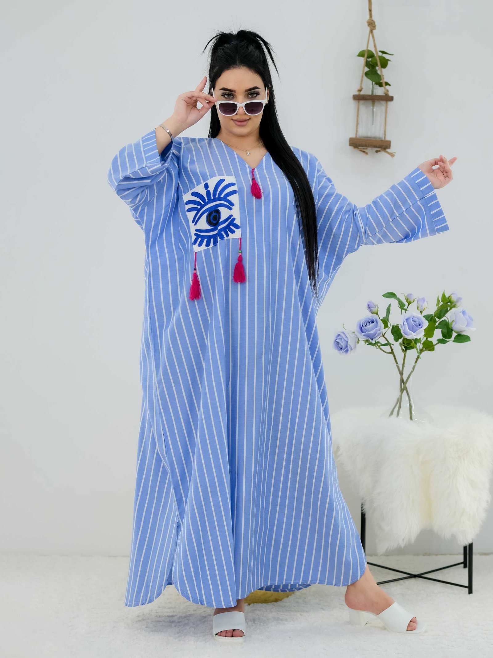 Style: Homewear Pattern: Veined Description: Jalabiya with Wool Thread Embroidery, Lilac Flowers, Hidden Belt, Fringes Neck: V-Collar Sleeve: Long with Elastic Cuffs Waist: Hidden Belt Length: 150cm Fabric Elasticity: Non-stretch Fabric Texture: Cotton Washing Instructions: Low-temperature machine wash or dry clean