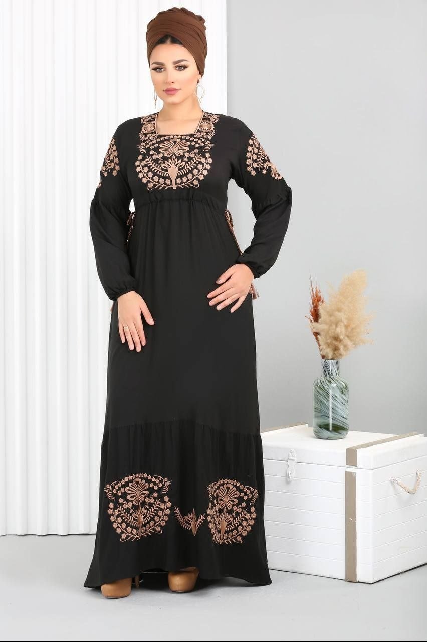 Style: Jalabya 1 Pattern: Embroidery Description: Dress decorated with Embellished on the chest and Tassels on the Sleeve and edges, Butterfly Style Neck: Square Collar Sleeve: long & wide sleeves Waist: Hidden Inner Belt Length: 142 cm Fabric Elasticity: Non-stretch Fabric Texture: Crepe