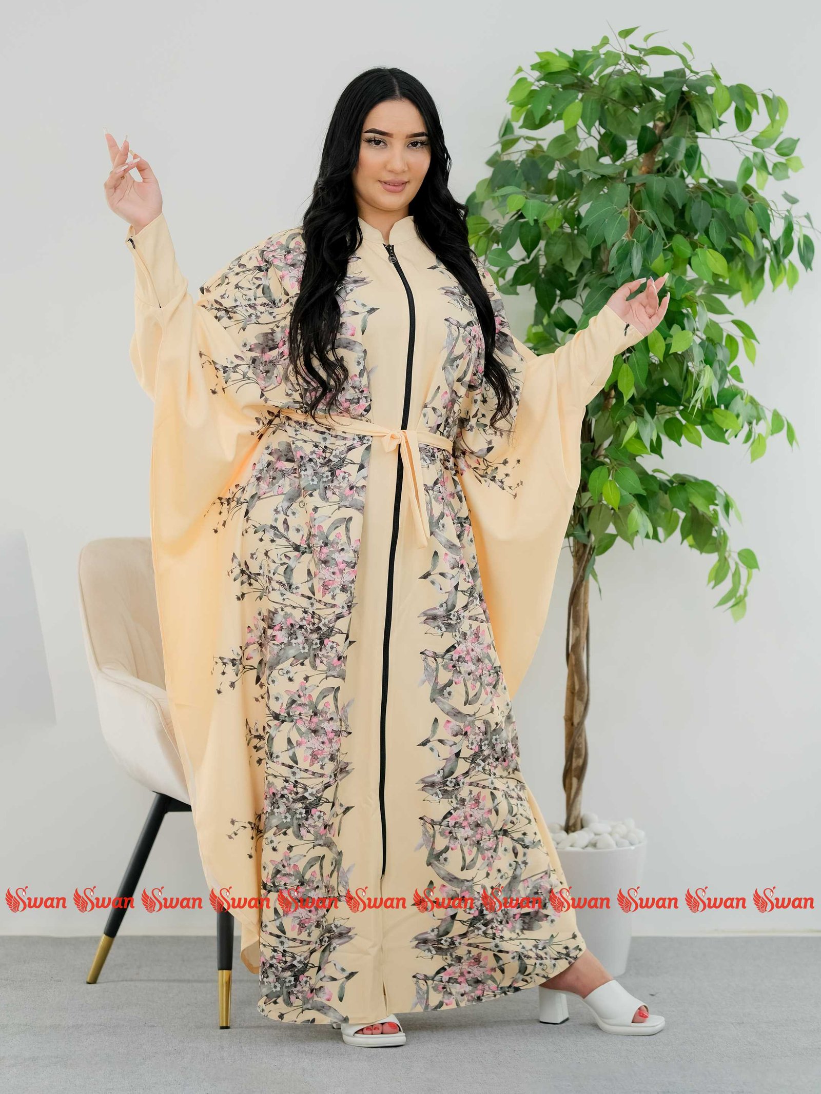 Style:Â Eastern Embroideries Pattern: Foliage Description: Foliage Jalabiya decorated with Sequins and shiny ribbon along the dress Neck: V-Collar Sleeve: Regular long Waist: Adjustable Inner Belt Length: 150cm Fabric Elasticity: Non-stretch Fabric Texture: Crepe CY