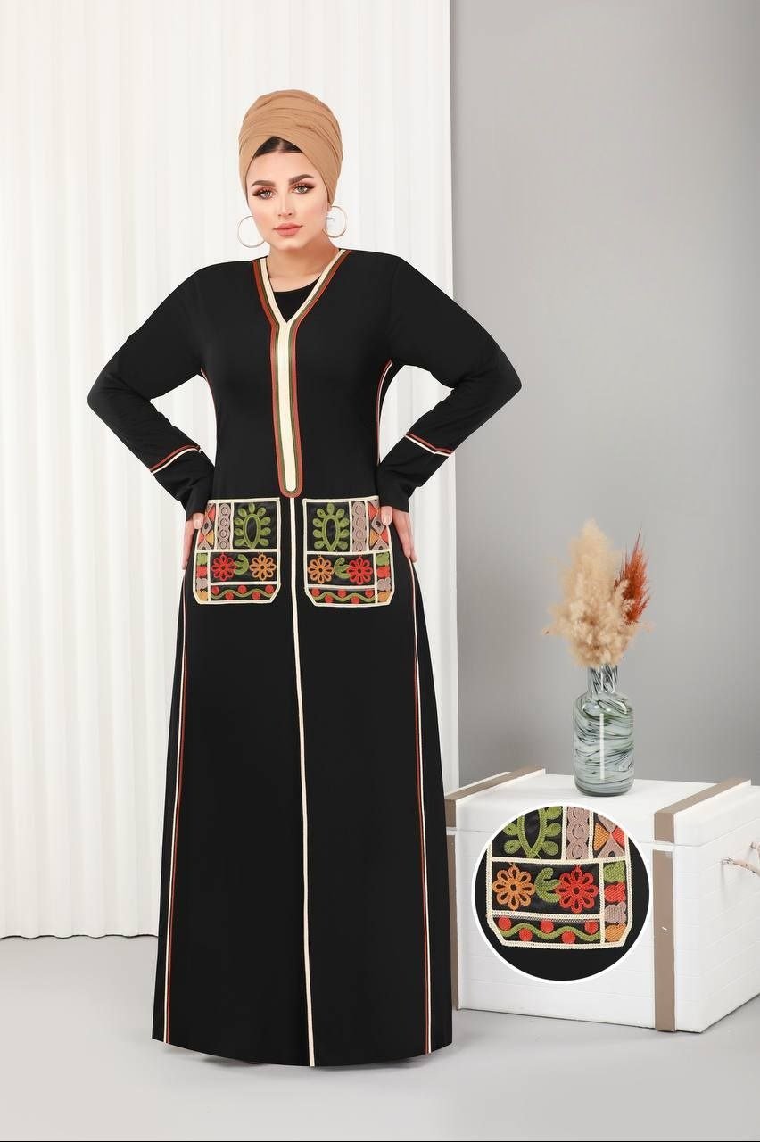 Style: Homewear Pattern: Random Description: Jalabiya with embroidery on the chest Neck: Round Collar Sleeve: Long and wide Waist: Hidden belt Length: 145cm Fabric Elasticity: Non-Stretch Fabric Texture: Cotton Viscose