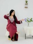 Style: Homewear Pattern: Geometric Description: A two tone color Jalabiya with Serma embroidery along its length. Neck: V-Collar Sleeve: Long and wide Waist: Hidden belt Length: 152 cm Fabric Elasticity: Non-stretch Fabric Texture: Crepe Washing Instructions: Low-temperature machine wash or dry cleaning