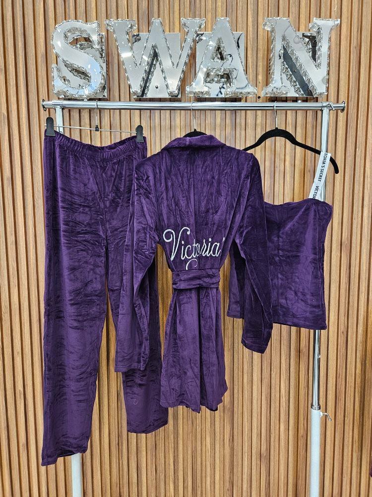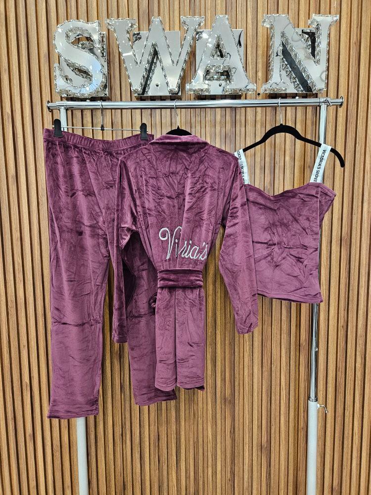 Style: Homewear Pattern: Checks Description: Pajama 3 pieces, decorated with Checks, jacket, capuche, sleeveless blouse, pants, Hidden Inner Belt Neck: Non Sleeve: Long Waist: Hidden Inner Belt Fabric Elasticity: Stretchable Fabric Texture: Lycra velvet