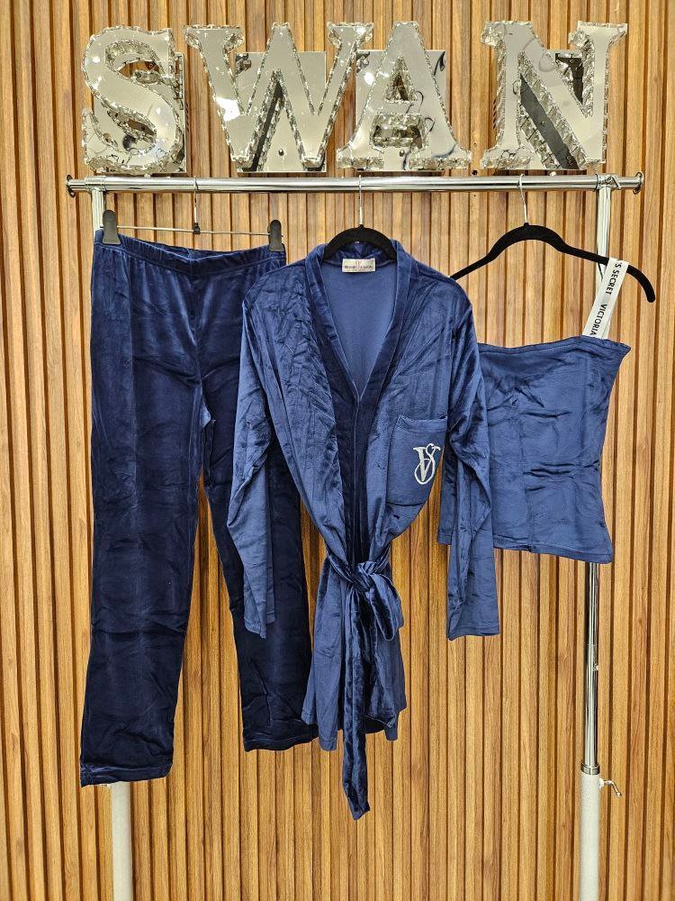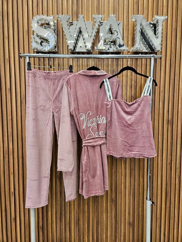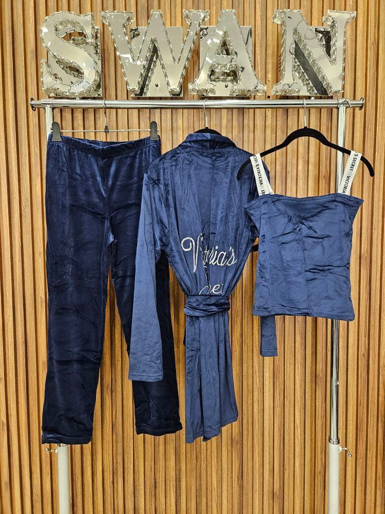 Style: Homewear Pattern: Wavy Description: Pajama 3 pieces, Wavy, Straps blouse, pants, robe, capuche decorated with fur, External belt Neck: NON Sleeve: Long Waist: External belt Fabric Elasticity: Stretchable Fabric Texture: Lycra velvet