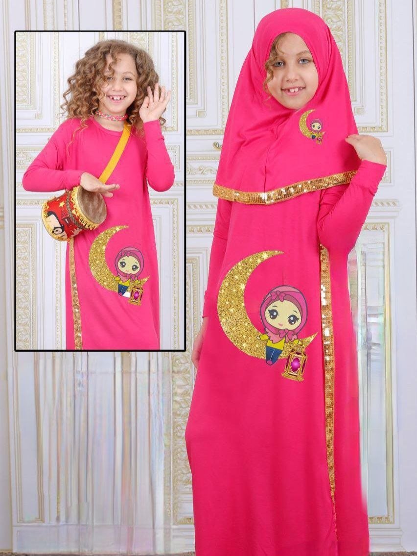 Style: Prayer Pattern: Sequins Number of Pieces: 2 pieces Description: Prayer Set, Crescent and Star Decorated Dress, Separated Hijab Neck: Round Collar 4 Length 80cm 6 Length 90cm 8Length 100cm 10 Length 110cm Sleeve: Long Waist: None Fabric Elasticity: Stretchy Fabric Texture: Cotton Lycra