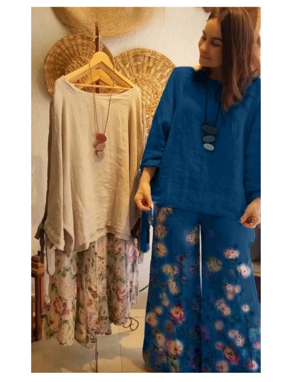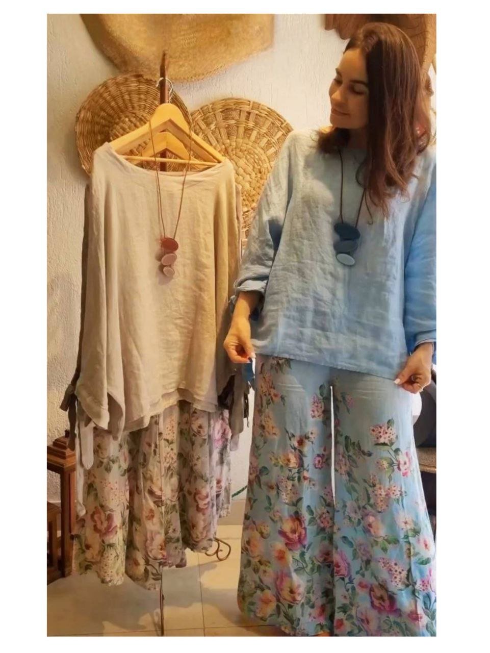 Style: Casual Pattern: Shells Description: 2 pieces, wide elastic waist pants, Long jacket decorated with beads and shell, side wide pockets Neck: Open Sleeve: Long and wide Waist: Elastic Length: Cardigan 130 cm Fabric Elasticity: Slightly Stretchable Fabric Texture: Crepe Washing Instructions: Low-temperature machine wash or dry clean