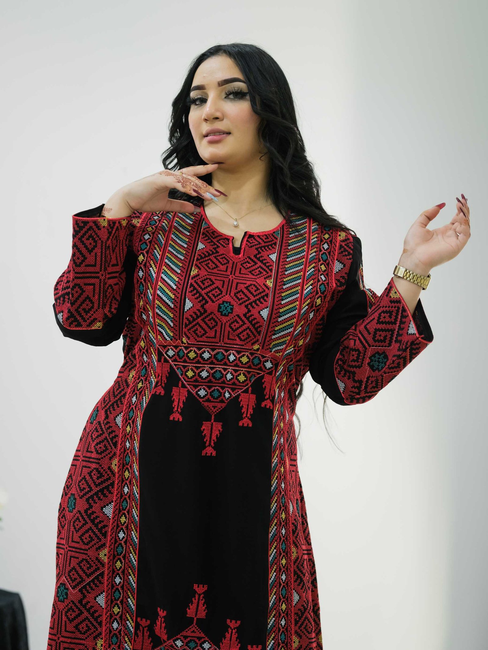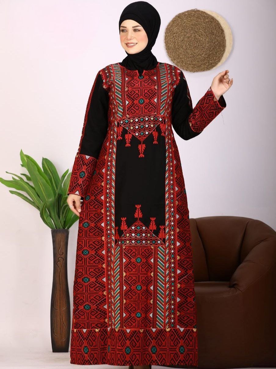 Style: Chic Pattern: Random Description: Jalabiya with dense cord embroidery, Fringe on the chest, Adjustable Inner Belt Neck: V-Collar Sleeve: 3/4 sleeve Waist: Adjustable Inner Belt Length: 145cm Fabric Elasticity: Non-stretch Fabric Texture: Crepe Washing Instructions: Hand wash or low-temperature dry clean