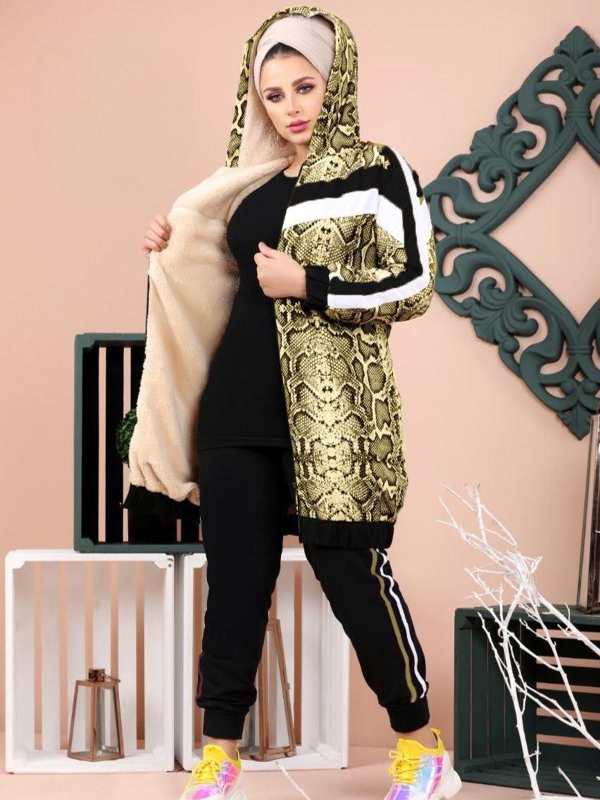 Style: Casual Pattern: Random Description: Two pieces set, elastic waist pants, zipper jacket with Random Print and waterproof fur lining, capuche, pockets Neck: None Sleeve: Long bracelet sleeves Waist: Elastic Fabric Elasticity: jacket: Not Stretchable / pants: Stretchable Fabric Texture: pants: Cotton Lycra fur lining/ jacket: waterproof fur lining