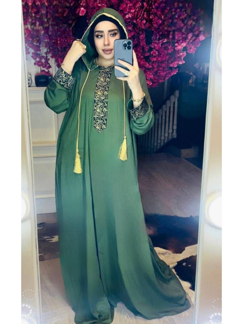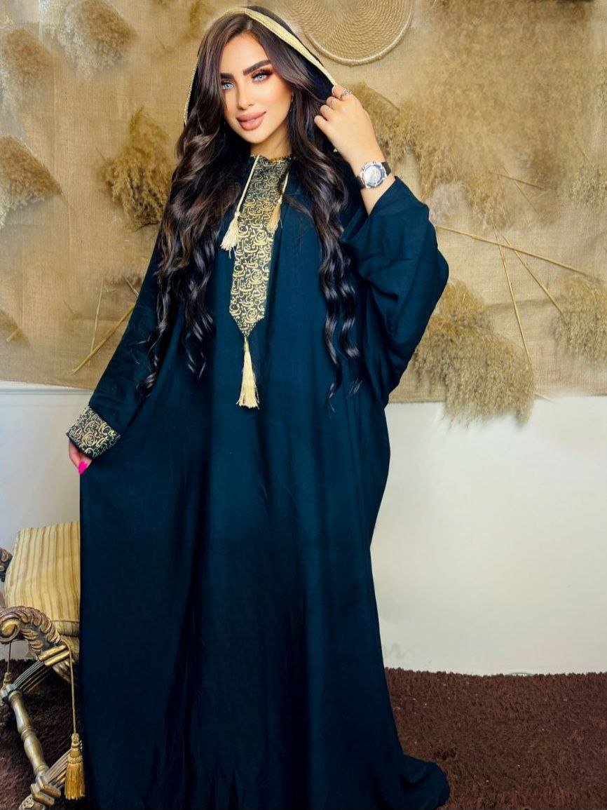 Style: Jellabiya Pattern: Letters Description: Jellabiya embroidered with Arabic letters on the chest and sleeve, shiny strip on the shoulder, Capuche Neck: None Sleeve: Long bracelet sleeves Waist: Regular Length: 145cm Fabric Elasticity: Non-stretch Fabric Texture: Crepe