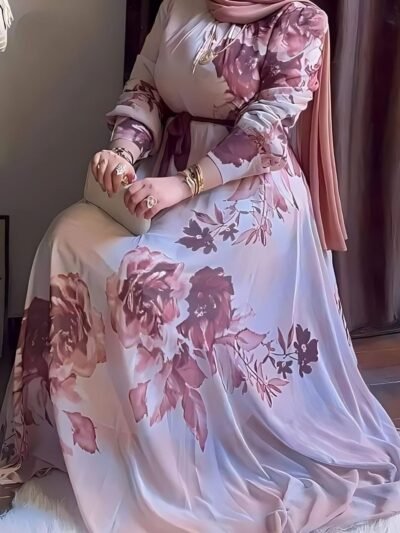 Style: Casual Chic Pattern: Floral Description: Cloche Belted Chiffon Dress with Rose Print and Chest Tie Neck: High Collar Sleeve: Long bracelet sleeves Waist: Belt Length: 146cm Fabric Elasticity: Non-Stretch Fabric Texture: Chiffon Washing Instructions: Low-temperature machine wash or dry clean
